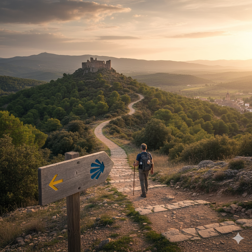 Su fundador, Javier Vicente Queralt, supo escuchar la voz de la memoria y, con paciencia y cariño, trazó el recorrido siguiendo antiguas veredas por donde caminaron tantas generaciones antes que nosotros. El camino tenía un destino muy especial: acercarnos a la Basílica del Pilar, faro de devoción y de referencia para quienes emprendían el viaje hacia Compostela, pues la Virgen del Pilar ha sido desde siempre el gran sostén espiritual de los peregrinos del Este. Desde sus inicios, se buscó la ruta más recta y natural que, atravesando nuestra provincia, nos guiara hasta el río Ebro, y con él, a los legendarios caminos que nos conducen a Santiago. Siete etapas separan la Ermita de Fadrell, punto simbólico de partida vinculado a la Orden de Santiago desde la reconquista, del Mas de la Matas, ya en la vecina provincia de Teruel. A lo largo de este trayecto, pueblos y gentes encuentran la oportunidad de integrarse en esta senda común, que hermana territorios y personas.